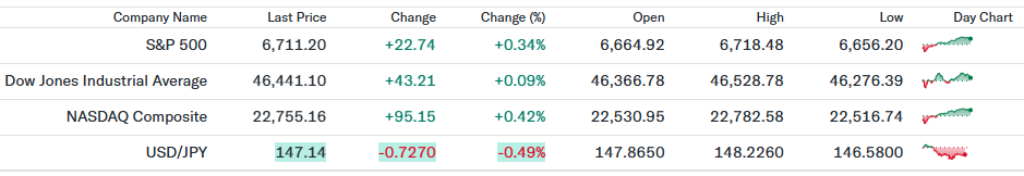 NASDAQ総合指数は堅調に推移し、主要3指数の中で相対的に上昇率が最も大きくなりました。米国の製造業指数改善やフィッチによる格付けへの影響否定が安心感を与え、金利低下期待と相まってハイテク株に買いが集まりました。AI関連や半導体株が牽引し、特に大型グロース株への資金流入が鮮明でした。成長期待が市場を下支えしています。 - ドル円