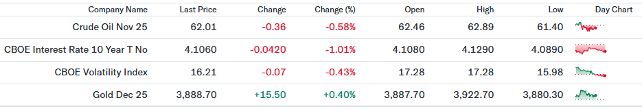 VIXは小幅に下落しました。米政府閉鎖にもかかわらず市場のパニックは広がらず、株式市場の堅調さが投資家心理を安定させました。依然としてボラティリティは低位水準にとどまっています。 - 金先物(3,888.70、+0.40%)