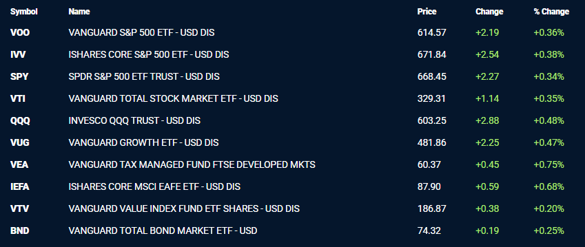 主なETFは総じて堅調に推移しました。S&P500連動型のVOO、IVV、SPYはいずれも0.3%台の上昇で、米国株全体を表すVTIも小幅高となりました。ハイテク比率が高いQQQやグロース株主体のVUGは0.4%台後半の伸びを示し、利下げ観測を追い風に成長株への資金流入が意識されました。一方、海外株を対象とするVEAやIEFAも0.7%前後上昇し、グローバル株式全般への買いが広がっています。バリュー株のVTVや債券ETFのBNDも小幅高にとどまり、投資家は景気回復と金融緩和期待を織り込みつつ分散投資を進める動きがみられます。