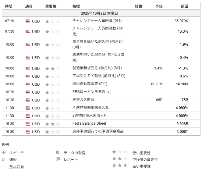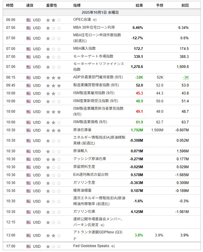 仕入価格は前月から小幅に低下しましたが、依然として60超えとインフレ圧力の強さを示しています。原材料コストの上昇が続くなかで、企業の価格転嫁力が試される局面です。インフレの高止まり懸念が残り、FRBの利下げペースを鈍化させる可能性もあります。 - 原油在庫量(EIA、9月最終週) +179.2万バレル(予想+150万、前回-60.7万)