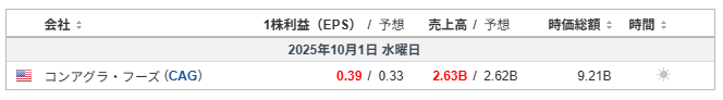 EPSは0.39ドルで市場予想0.33ドルを上回り、収益力の改善が示されました。一方で売上高は26.3億ドルと市場予想26.2億ドルをわずかに超過したに留まり、トップラインの伸びは限定的です。コスト削減や価格改定による利益率改善が評価される一方、消費者需要の鈍化が課題となっています。食品メーカーとしてディフェンシブな性格を持つ銘柄ですが、成長加速には新製品投入やシェア拡大が不可欠です。