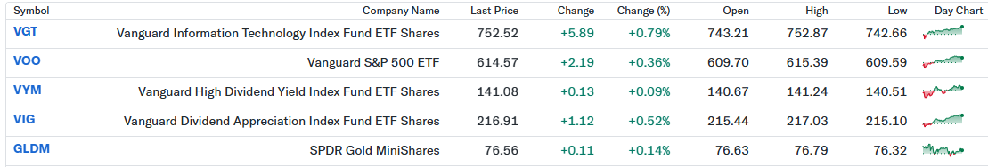 本日の私のポートフォリオは総じて堅調でした。特にVGTが+0.79%とハイテクセクターの強さを反映して上昇し、全体を押し上げました。VOOやVIGも0.3~0.5%高と堅調で、ディフェンシブ性を意識したVYMやGLDMは小幅な上昇にとどまりました。市場は利下げ観測と景気指標の改善が交錯し、成長株優位の展開となりました。