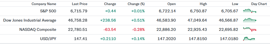 S&P500はほぼ横ばいで引けました。エネルギーや資本財株は上昇したものの、ハイテクや一部消費関連株が重しとなり、全体の方向感は限定的でした。経済指標の発表を控えて様子見姿勢が強く、日中は小幅なレンジでの推移に終始しました。 - Dow Jones Industrial Average(46,758.28、+238.56、+0.51%)