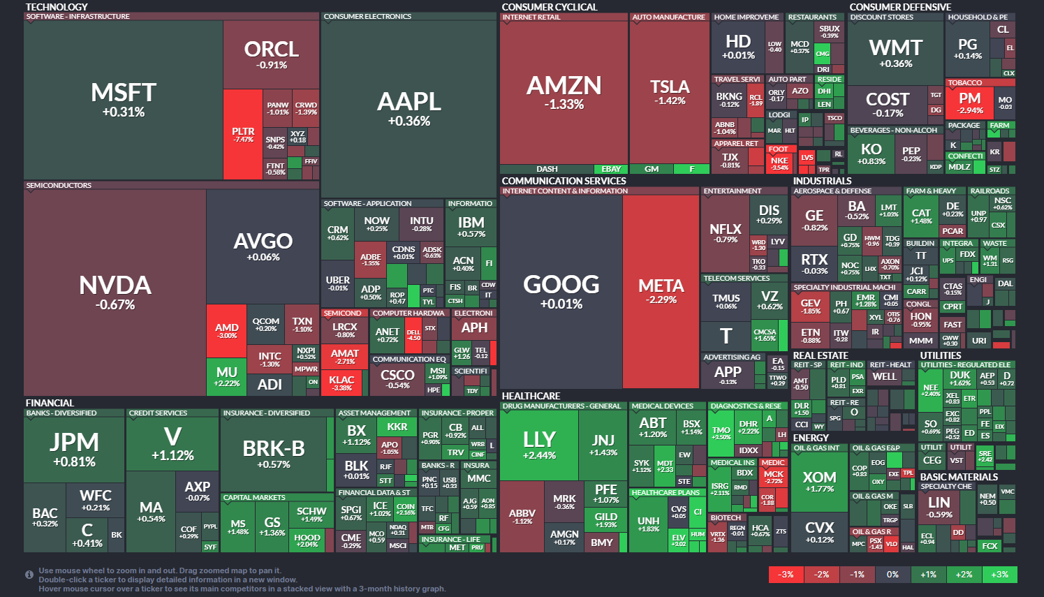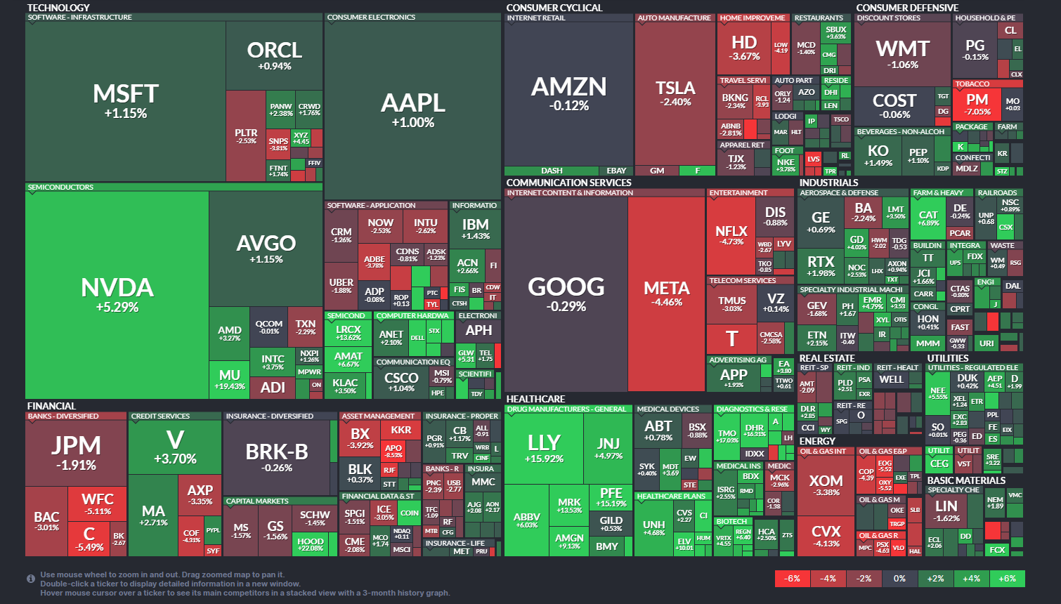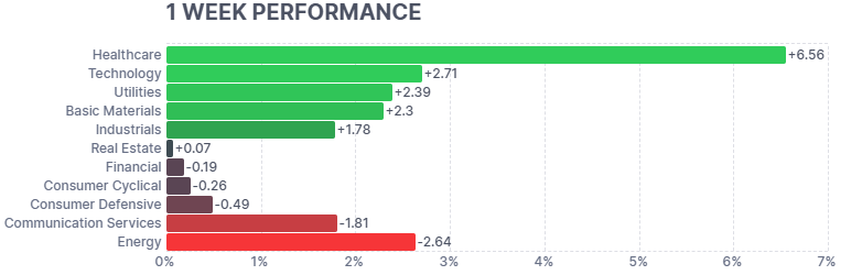 特に半導体/AI関連銘柄(例:NVDAなど)の上昇が著しかったことが目立ちます。NvidiaはAI投資拡大期待を背景に上値を追う展開となり、株価は上昇トレンドを強めています。また、ヘルスケア(Healthcare)セクター株も好調で、Humana など保険・医療株に政策期待が寄与しました。一方、通信やエネルギーセクターは相対的に軟弱な動きとなっています。 - セクター別1週間の騰落率の背景