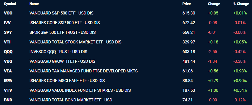 主要ETFは総じて小動きとなりました。S&P500連動型のVOOやSPYはほぼ横ばい、VTIも小幅高にとどまりました。一方、ナスダック連動のQQQや成長株中心のVUGは下落し、ハイテク株の弱さが影響しました。逆に欧州・先進国株に投資するVEAやIEFAは上昇し、グローバル分散投資が支えとなりました。バリュー株ETFのVTVも堅調で、景気敏感株や金融株の強さが反映されています。債券ETFのBNDは金利上昇を背景に小幅安となりました。