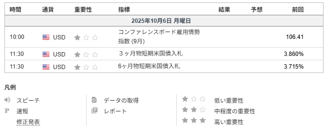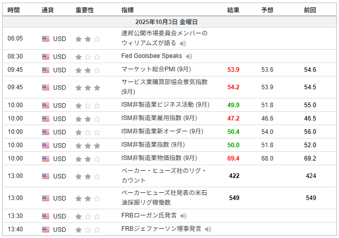 米国の総合PMIは予想を上回ったものの前回から低下し、成長の勢いが鈍化したことを示しました。製造業とサービス業の両方で活動は拡大を続けていますが、前月比での鈍化が市場の警戒材料となりました。景気後退懸念は後退しつつも、成長加速の確信は乏しい内容でした。 - ISM非製造業景況指数(9月):53.4(予想53.9、前回53.6)