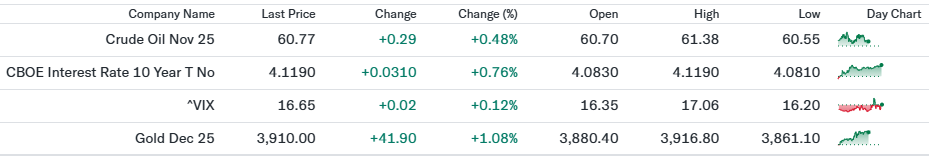 VIX(恐怖指数)は小動きにとどまりました。株式市場は方向感を欠きつつも下値は限定的で、投資家心理に大きな変化はなく、ボラティリティは低位安定が続いています。 - 金先物(+1.08%、3,910ドル)