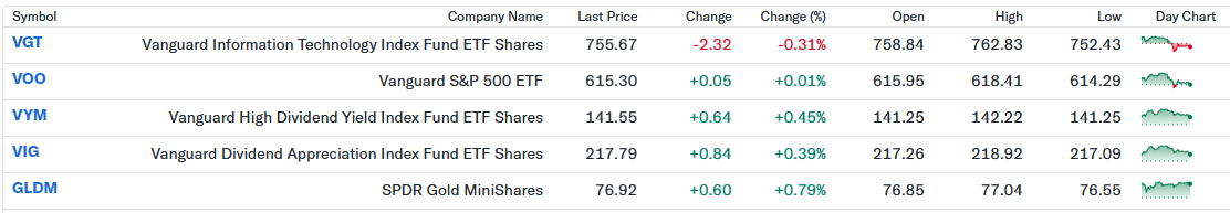 私のポートフォリオは前日比+0.07%と小幅ながら上昇しました。主力のVOOは横ばいでしたがVYMやVIGが堅調に推移し、配当重視の銘柄が全体を押し上げました。一方でVGTが軟調となり、ハイテク比重の弱さが足かせとなりましたが、金ETFのGLDM上昇も支えとなり、総合的にはプラスで終えました。