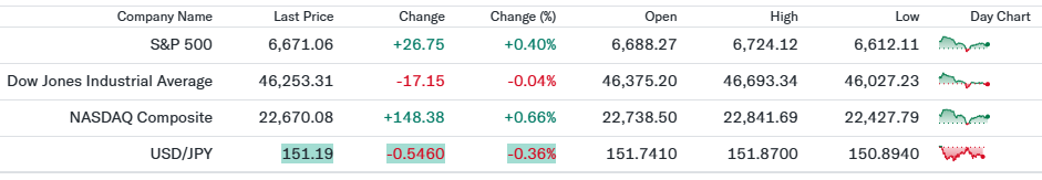 - S&P500(終値:6,671.06、前日比 +0.40%)