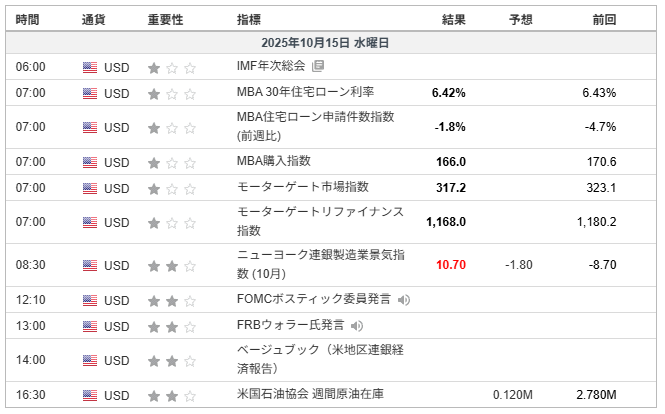 結果は+10.70と、前回の-8.70から大幅に改善し、市場予想(-1.80)を大きく上回りました。新規受注や出荷の回復が確認され、製造業の景況感が一時的に持ち直したことを示しています。ただし、仕入れ価格や雇用動向はまだ不安定で、持続的な改善には慎重な見方も残っています。 - MBA住宅ローン申請指数(前週比)