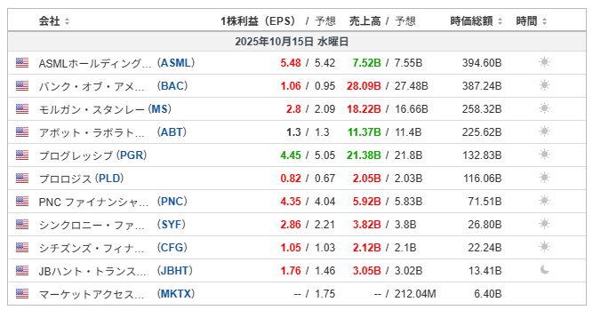 1株利益5.48ドル(予想5.42ドル)、売上高75.2億ドル(予想75.5億ドル)とおおむね予想通りでした。次世代EUV露光装置の受注が引き続き堅調で、AI向け半導体製造投資が追い風となっています。中国向け規制による影響は限定的で、安定成長への期待が維持されました。 - BAC(バンク・オブ・アメリカ)