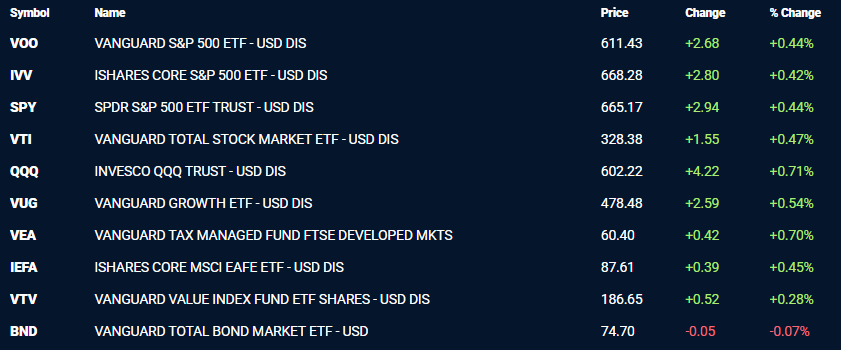 主要ETFは総じて上昇しました。S&P500連動型のVOOやSPY、IVVはいずれも+0.4%前後の上昇となり、広範な銘柄への買い戻しが見られました。特にハイテク株中心のQQQ(+0.71%)やグロース株中心のVUG(+0.54%)が強く、AI・半導体関連への投資意欲が引き続き高まりました。一方、バリュー株主体のVTVは小幅高にとどまり、債券ETFのBNDは金利上昇観測後退にもかかわらずわずかに下落し、株式市場に資金が戻ったことを示しました。