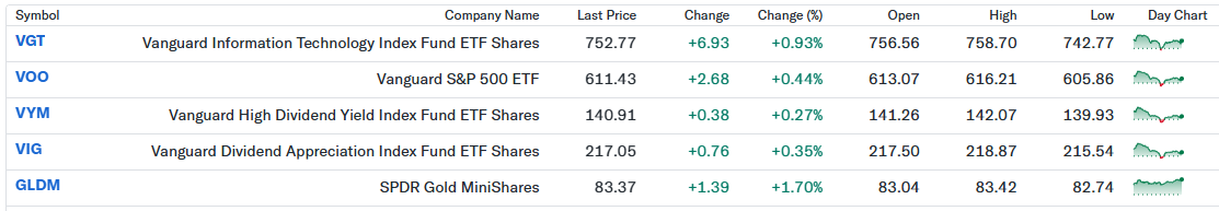 昨夜は堅調でした。VGT(先端技術)やGLDM(金)が上昇を牽引し、特に金価格の上昇がリスク分散効果を発揮しました。高配当系のVYMや安定成長型のVIGも堅調で、バランスの取れた上昇となりました。全体的にリスクオンと安全資産買いが同時進行した1日でした。