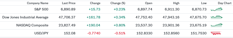 テクノロジー・成長株比率が高いNASDAQが0.80%上昇して23,827.49となりました。AIや半導体関連の好調が目立ち、リスク選好の流れが強まったことが示されています。 - ドル円