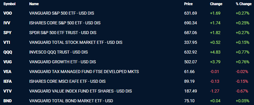 主要ETFは総じて小幅高となりました。S&P500連動型のVOOやSPYが+0.2%台の上昇を見せ、テクノロジー株中心のQQQやVUGがそれぞれ+0.7%超と堅調でした。生成AI関連銘柄への資金流入が続き、米国株全体を押し上げました。一方で、バリュー株中心のVTVは-0.67%と軟調で、金利上昇局面でディフェンシブ資産が売られました。債券ETFのBNDは小幅に上昇し、金利動向をにらんだ買い戻しが見られました。