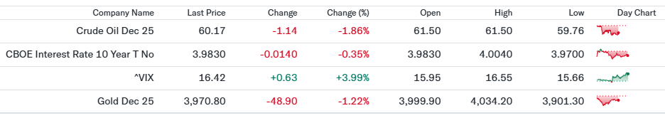 株式市場のボラティリティ指標であるVIXは小幅上昇しました。ハイテク株中心に買い優勢でしたが、イベント前のヘッジ需要が下支えとなりました。 - 金先物 3,970.80ドル(前日比-1.22%)