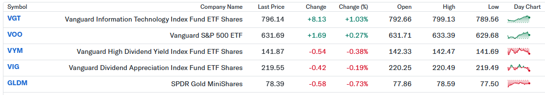 前日比+0.04%と小幅高でした。VGT(先端技術ETF)が+1.03%上昇し、テクノロジー株の上昇が全体を支えました。一方で、高配当ETFのVYM(-0.38%)や金ETFのGLDM(-0.73%)が重しとなりました。市場では金利低下観測が強まる中、成長株中心に資金が流入する展開でした。