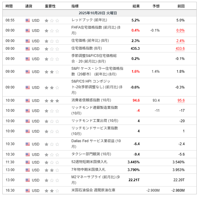 結果は+0.4%と予想(-0.1%)を上回り、住宅市場の底堅さを示しました。住宅ローン金利が高止まりする中でも、供給不足と堅調な雇用が価格を下支えしています。インフレ再燃への懸念をやや強める結果となりました。 - S&P/ケース・シラー住宅価格指数(8月・前年比)