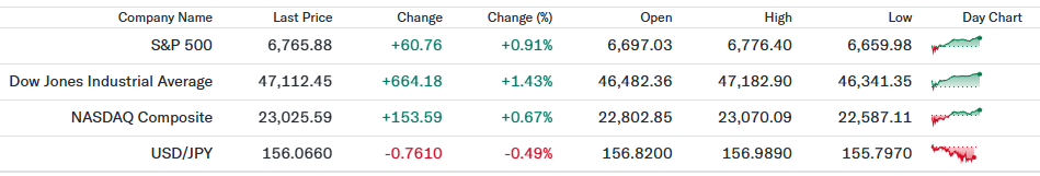 景気減速懸念を背景に長期金利が低下し、グロース株に資金が向かった一日。特にAI関連や半導体関連の堅調さが指数を底上げし、エネルギー安を受けたインフレ鈍化観測も追い風となった展開。米小売・消費者関連指標の弱さがむしろ利下げ期待を高め、金利敏感株に買いが広がる構図。終日堅調な推移を維持した相場展開。 - Dow30(47,112.45、+1.43%)