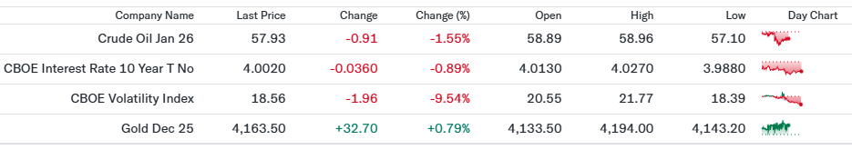 米雇用・消費関連指標の軟化で景気減速懸念が広がり、12月利下げ観測が急速に強まったことで利回りが低下した流れ。次期FRB議長候補報道もハト派期待を誘い、安全資産志向が高まった推移。 - VIX(18.56、−9.54%)
