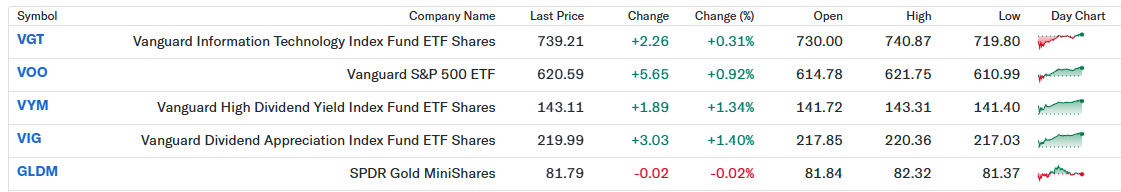 私の米ドル建てポートフォリオは前日比+0.67%と堅調に推移しました。金利低下を受けて株式市場が全体的に買われ、特にVOOやVIG、VYMといった株式ETFがしっかりと上昇したことが寄与しています。VGTも堅調で、ハイテクセクターの底堅さを感じます。GLDMは小幅安でしたが、全体としてはバランスよく伸びてくれて安心感のある一日でした。