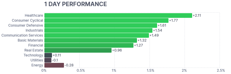 医薬品やバイオ関連を中心にディフェンシブ需要が高まり、景気指標の弱さを背景に資金が流入した一日。 - Consumer Cyclical(一般消費材)+1.77%