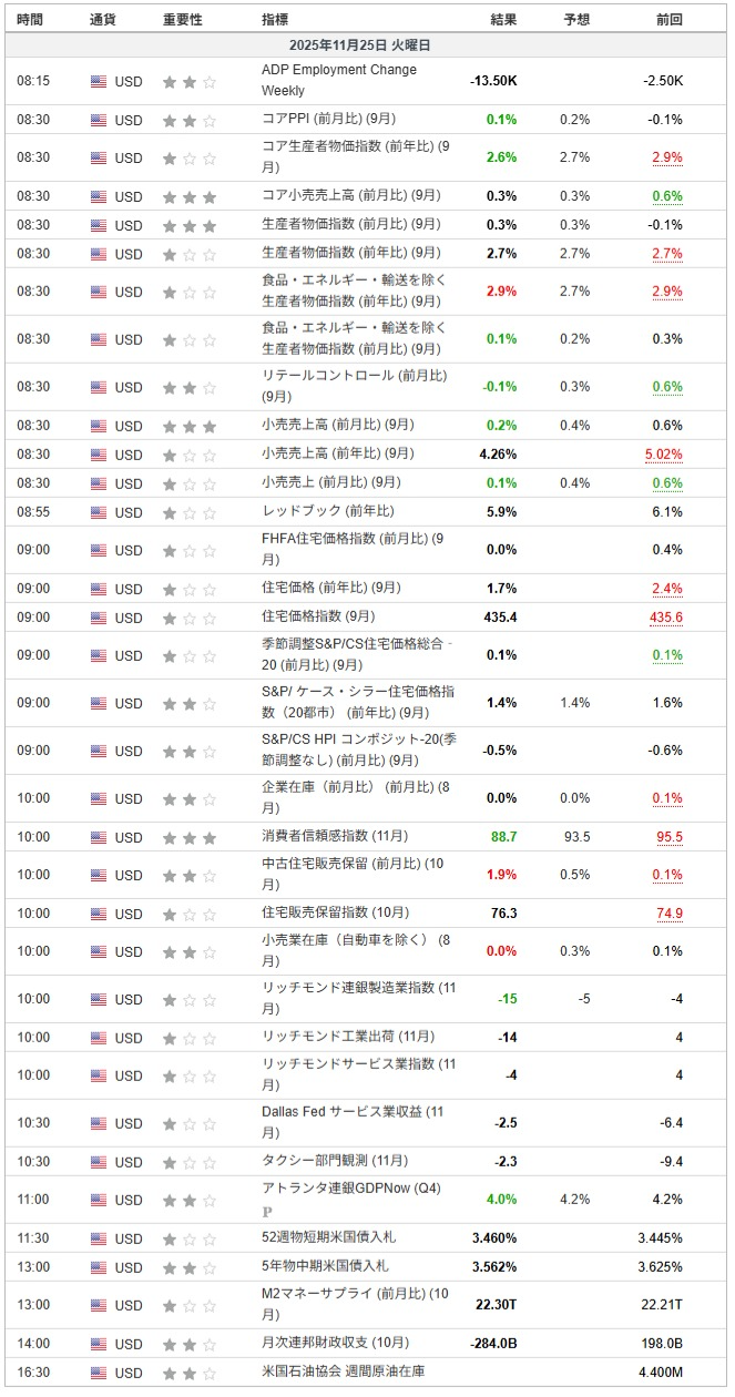 堅調な個人消費を示す一方で、伸び率は前回の+5.02%から鈍化し、消費の勢いに減速感が見られたことが注目された結果。金利高の影響がじわりと表れ始めている可能性があり、景気成熟局面を意識させる材料。 - 消費者信頼感指数(11月) 88.7(予想93.5)