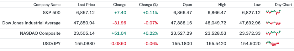 ハイテク株と一部ディフェンシブ銘柄(景気変動の影響を受けにくい銘柄)の底堅さが指数を下支えし、終日を通じて狭いレンジながらプラス圏を維持した展開。FOMCを控えた様子見基調の中でも、労働市場の強さと景気指標の底堅さが評価され、指数全体としては安定的に推移した相場展開。 - Dow30(47,850.94、-0.07%)