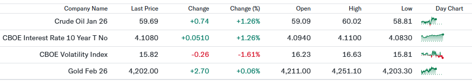 30年物JGB(日本国債)の好調入札を受けて長期金利が低下し、日本株が大幅高となった流れがアジア市場全体のセンチメント改善につながる展開。米10年債利回りは4%前後で落ち着きを取り戻しつつあり、世界の株式市場は「年末ラリー」と「利下げ前の高値警戒」の綱引きとなる局面(Reuters:12/04) - 金価格横ばいと原油市況ににじむ地政学リスク