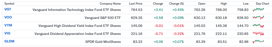 私のポートフォリオは前日比+0.09%と小幅高で推移し、全体として堅調な一日だったと感じています。特にVGTとVOOが上昇したことで、ポートフォリオ全体をしっかり支えてくれました。一方で、VYMとVIGはわずかに下落しましたが、下げ幅は限定的でした。また、GLDMが小幅ながらプラスとなり、株式の値動きを程よく緩和してくれた印象です。株式・金のバランスがうまく働いた落ち着いた相場だったと思います。