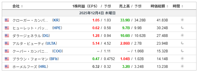 EPS1.05と予想1.03を上回り、売上33.9Bも実質的に予想と一致し、堅調な消費を背景に安定した業績を示した決算。食品インフレ鈍化に伴う利益率の調整はあるものの、自社ブランド強化や効率的な在庫管理が奏功し、収益基盤の底堅さを示した評価内容。 - HPE:Hewlett Packard Enterprise(Technology)