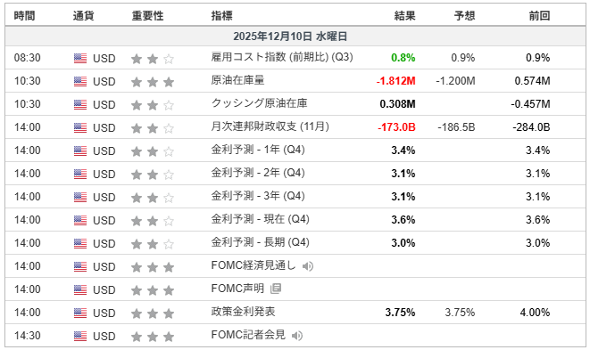 財政赤字が予想(−1865億ドル)を若干上回る改善となったが、依然として巨額赤字が続く状況。歳出増加と利払い費の急増が構造的に財政を圧迫しており、米国債供給増長期化を示唆。長期金利の上昇圧力につながる潜在リスクとなり、金融市場全体のボラティリティを高める要因として意識される展開。 - FOMC政策金利 3.75%(0.25ポイント利下げ)