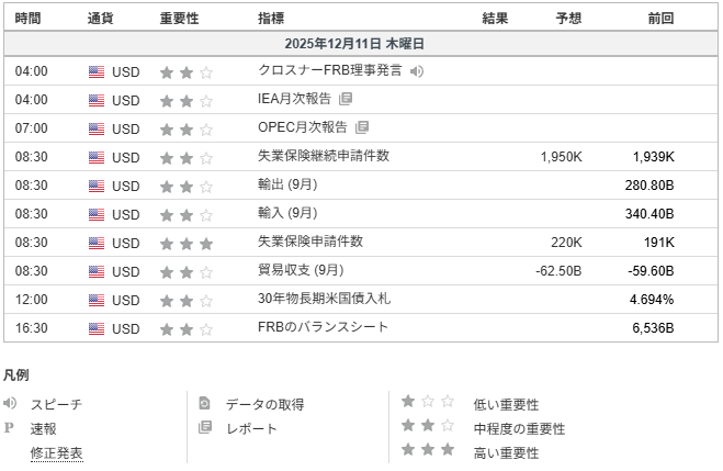 米国原油価格の指標となるクッシング在庫が小幅に増加し、需給逼迫懸念がやや後退した状況。原油市場ではターミナル在庫の増減が価格に直接影響するため、供給余力が一定程度維持されていることを示唆。ただし増加幅は限定的であり、全体の在庫減少トレンドを相殺するほどではなく、相場の方向性には中立的に働く展開。 - 月次連邦財政収支(11月)結果:−1730億ドル