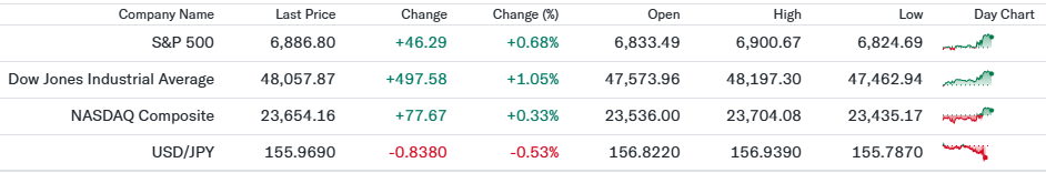 FOMCによる0.25ポイント利下げを追い風に、金利低下期待が広がり、広範なセクターで買いが優勢となった展開。特に大型テクノロジーとディフェンシブ業種の堅調さが指数を押し上げ、終日を通じて安定した上昇基調を維持。インフレ鈍化と賃金指標の落ち着きが金融環境改善を示唆し、リスク選好が高まった地合いとなった相場動向。 - Dow30(48,057.87、+1.05%)