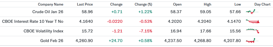 利下げによる金融環境改善期待が市場心理を好転させ、ボラティリティ低下が進んだ動き。株式市場の上昇基調が続く中でリスク選好が高まり、地政学懸念を織り込みつつも警戒感が後退した水準。 - 金先物(4,260.90ドル、+0.58%)