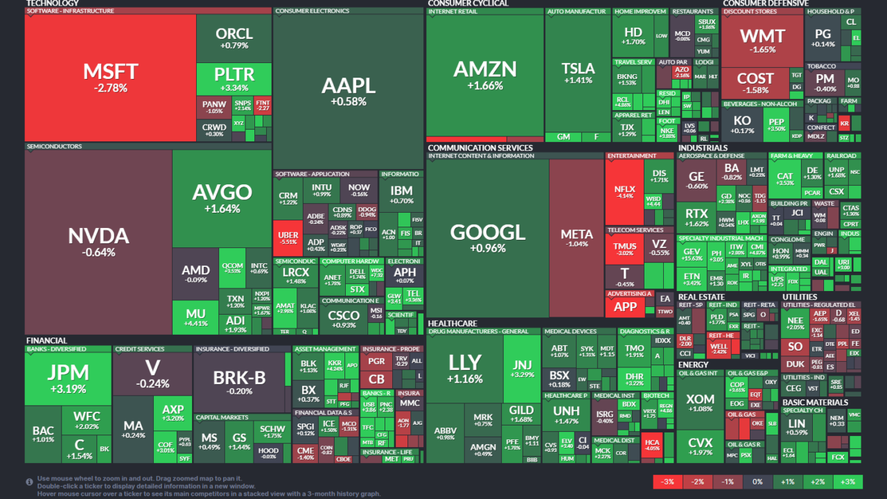 政府・企業向けAI分析需要の拡大が引き続き評価され、成長ストーリーへの信認が維持された展開。利下げ環境で将来キャッシュフローの割引率が低下し、高成長株への資金流入が強まった相場状況。 - JPM(JPMorgan Chase & Co)Financial:+3.19%