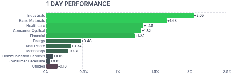 金利低下と資源価格の安定を背景に、素材(Basic Materials)セクターに買いが入りやすい地合いとなった展開。景気下支え期待が需要増への思惑を強め、化学・金属・素材関連銘柄を中心に堅調さが際立った相場動向。 - Healthcare(+1.35%)