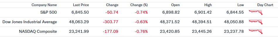 年末最終日の薄商いの中で利益確定売りが優勢となり反落。米国債利回りの高止まりがバリュエーション(株価の割高感)を意識させ、先端技術を中心に上値を抑制。原油や貴金属も軟調でリスク資産全般に慎重姿勢が広がり、日中高値から押し戻される展開。 - Dow30(48,063.29、前日比-0.63%)