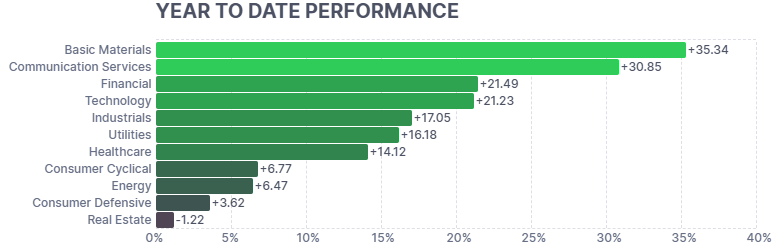 素材、通信サービス、金融、先端技術が高い上昇率を記録。インフレ沈静化と景気減速回避への期待からリスク選好が強まり、AI投資や広告市場回復が追い風となった構図。工業・産業や公益事業もインフラ投資と安定収益でプラス圏を維持。反対に不動産は金利水準の高さが重荷となりマイナス圏に沈み、金利環境がセクター間パフォーマンスを左右した一年。