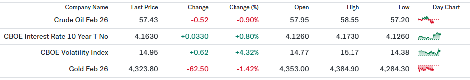 VIX指数は上昇し15近辺へ。主要株価指数の下落と年末特有の流動性低下を背景に、短期的な不安心理が強まった形。急激なリスク回避ではないが、先行き不透明感を映す動き。 - 金先物