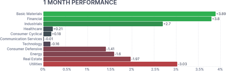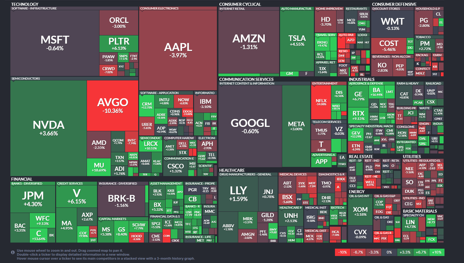 先端技術では半導体の選別が進み、AI関連の需要期待からNVDAが堅調となる一方、AVGOなど一部大型株は利益確定売りで下落。通信サービスではMETAが広告需要の回復期待で上昇する一方、娯楽分野は調整。金融では金利高止まりを背景に銀行株が買われ、月内で明暗が分かれる展開。 - 今月のセクター別騰落率
