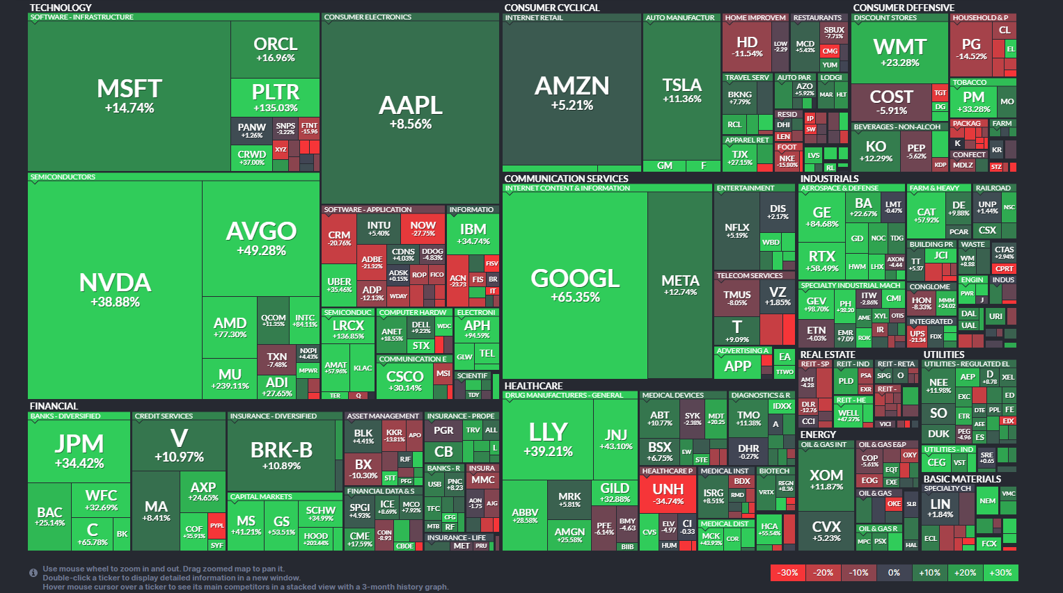 先端技術と通信サービスが年間を通じて相場をけん引。生成AI関連の投資拡大を背景にNVDA、AVGO、MSFT、GOOGLなどが大幅上昇し、データセンター、半導体、クラウド分野への資金集中が鮮明。金融では金利高止まりを追い風に大手銀行や資産運用株が堅調。一方、公益事業や不動産は金利負担増を背景に相対的に出遅れ、銘柄間の明暗がはっきり分かれた一年。 - 今年のセクター別騰落率