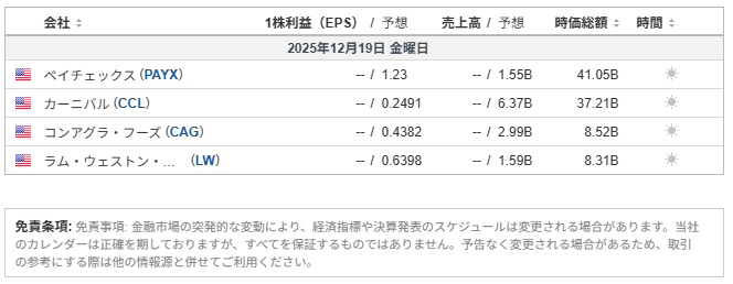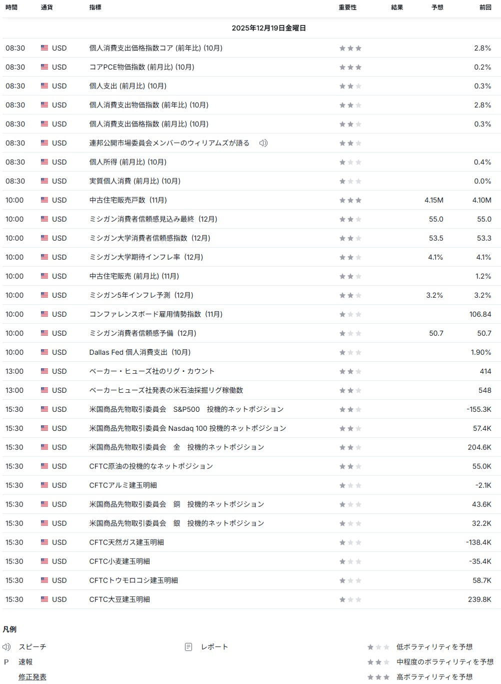 米10年国債利回りがインフレ鈍化を背景に低下し、債券と比較した株式の期待リターンが改善。割引率低下(将来利益の現在価値が高まる効果)が株価評価を押し上げ、成長株・AI関連銘柄への資金流入が目立つ状況(Reuters:12/18) - ドル高一服で為替市場は方向感に欠ける展開