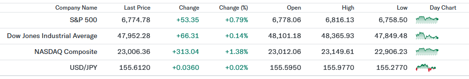 長期金利低下を好感し、AI関連や半導体を中心とする成長株が大きく上昇。将来利益の割引率低下が評価を押し上げ、指数は主要3指数の中で最も強い動き。リスク選好の回復が鮮明となり、資金が成長テーマに集中した相場展開