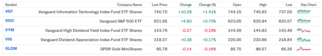 私のポートフォリオは前日比+0.45%と堅調な動きとなりました。先端技術セクターを中心に株式市場が上昇したことで、VGTやVOOが全体を押し上げる形となりました。一方で、高配当株中心のVYMは金利動向やディフェンシブ志向の後退を受けて小幅安となり、金関連のGLDMも安全資産需要の一服から軟調でした。成長株と配当株の値動きの違いがはっきりと表れた一日で、分散投資の効果を改めて実感する内容でした。