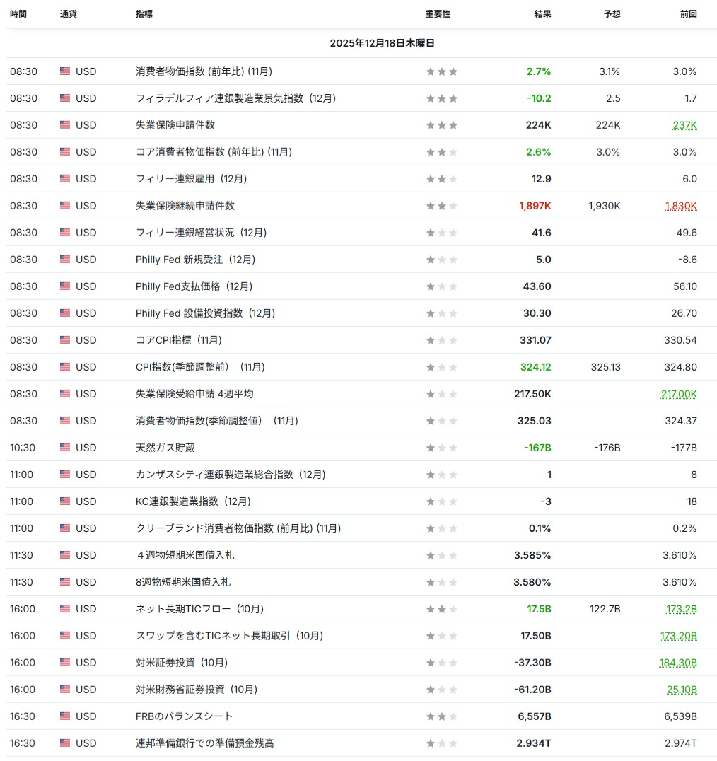 結果は+2.7%と市場予想+3.1%、前回+3.0%を下回り、インフレ減速が明確となった内容。エネルギーや財価格の落ち着きが寄与し、FRBの金融引き締め継続観測が後退。長期金利低下を通じて株式市場、とくに成長株に追い風となった指標結果。 - コア消費者物価指数(前年比、11月)