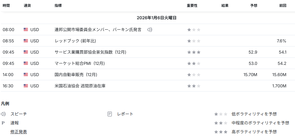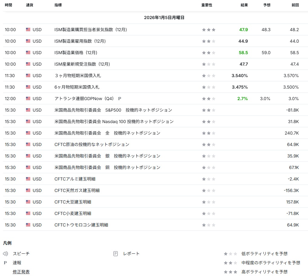 通常発表される投機筋のポジションデータが未更新。年初や祝日を挟んだ影響で公表が遅れている可能性。市場心理を測る材料として注目度が高く、次回更新時の変化が意識される状況。 - CFTC商品先物ポジション(金・原油・天然ガス等):発表遅延