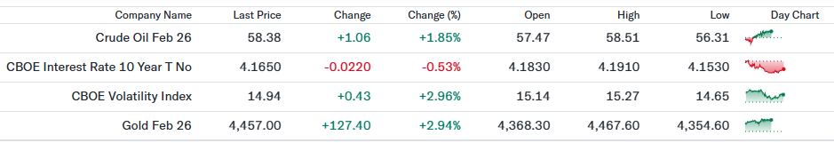 週末のマドウロ大統領拘束を受け、原油関連(Exxon、Chevronなど)と防衛関連が買われ、金融も上昇して株高を後押しした構図。地政学リスクより「資源アクセス期待」が優勢となった市場反応(Reuters:01/05) - ベネズエラ情勢でもリスクオフ限定、株・債券は底堅く推移