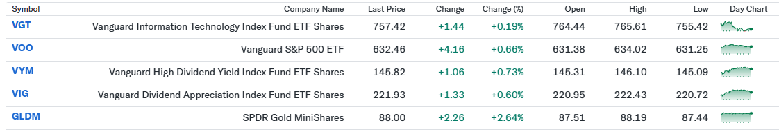私のポートフォリオは前日比+1.02%と堅調な一日でした。VOOを中心に米国株全体が上昇し、金融・素材・工業株の強さが指数を押し上げたことが寄与しました。VYM、VIGといった配当系ETFも安定した値動きとなり、守りと攻めのバランスが機能した印象です。加えて、地政学リスクと米金利低下を背景にGLDMが大きく上昇し、分散効果を改めて実感する一日となりました。
