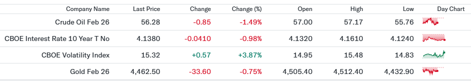 VIX指数は15台前半へ上昇し、市場の警戒感がやや高まった動き。主要株価指数が高値圏で調整する中、先行き不透明感に備えるヘッジ需要が増加。急激なリスクオフではないものの、投資家心理の慎重化を映す水準。 - 金先物